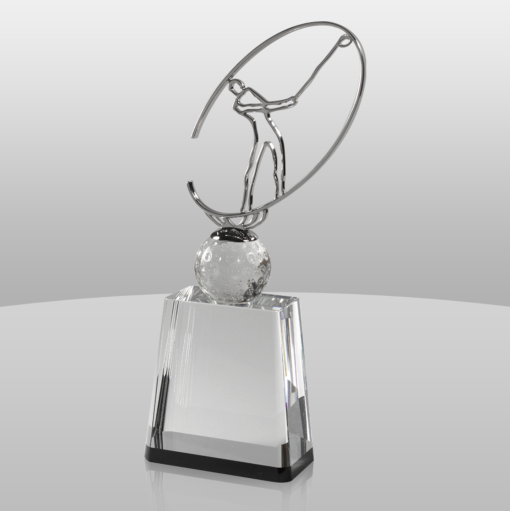 This award features a beautifully crafted crystal figure of a golfer in mid-swing. The crystal’s clarity and precision cut enhance the intricate details of the golfer, making it a standout piece in any awards collection.
