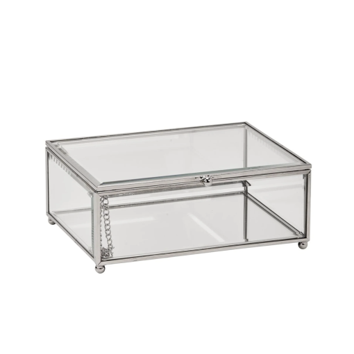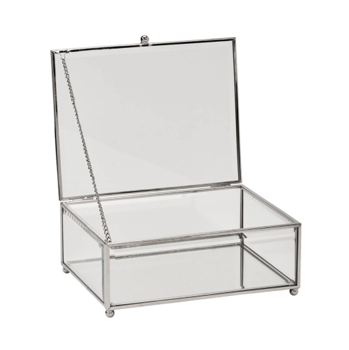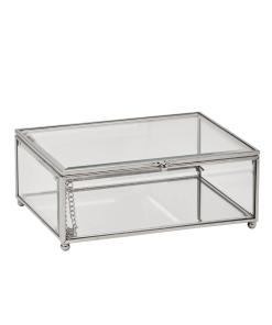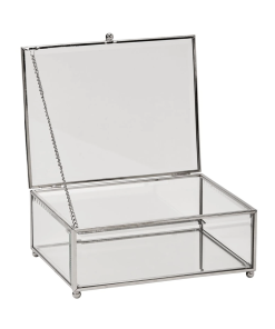 Made from premium glass and metal, this box is designed to be both sturdy and elegant. The clear panels allow for easy viewing of the contents, while the hinged lid provides convenient access and secure closure.