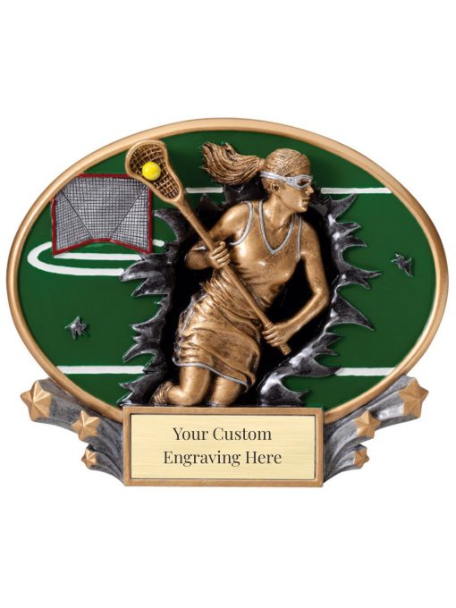 This plaque features a dynamic action pose of a female lacrosse player, capturing the speed and intensity of the sport. The design highlights the athlete in mid-motion, showcasing her power and precision on the field.
